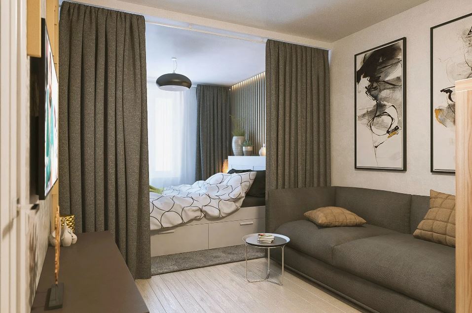 Текстильные решения — еще один эффективный инструмент для создания зональности внутри помещения. Длинные шторы или занавески позволяют быстро изменять конфигурацию пространства без необходимости серьезных конструктивных изменений.